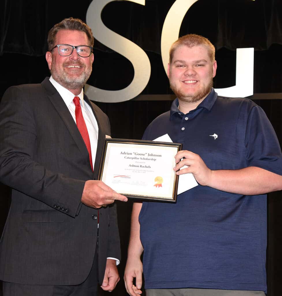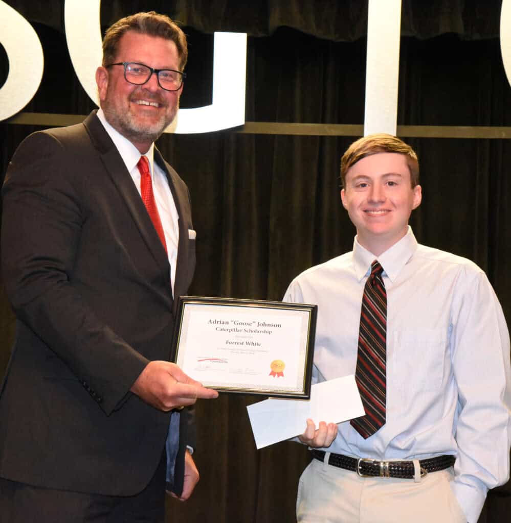 Ashton Lane Rachels of Odenville, AL and Forrest Weldon White of Rockford, AL, Thompson Tractor South Georgia Technical College Caterpillar Think Big Heavy Equipment Diesel Technology program graduates were awarded the Adrian “Goose” Johnson tool scholarships in memory of former CAT Thompson Tractor Think Big student Adrian “Goose” Johnson at the SGTC Caterpillar Dealers Graduation Dinner recently.