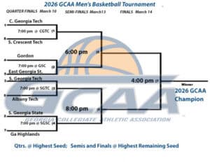 The winners of those game will advance to the semi-final round on Friday, March 13. The winner of the Central Georgia Tech – Southern Crescent Tech game will play at 6 p.m. Friday, followed by the winners of the South Georgia Tech – Albany Tech game and the South Georgia State and Georgia Highlands games at 8 p.m. Friday. The two winners will meet in the NJCAA Region XVII finals at 4 p.m. Saturday, March 14th.