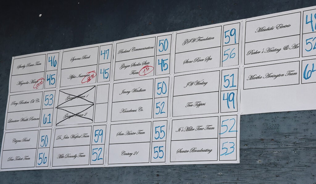 There was a three-way tie for first place with identical 45 scores but a regression tie scoring option left the Ginger Starlin State Farm team in first place over Magnolia Manor and Alfa Insurance teams.  The “Sparky Reeves Team” of Kevin Reeves, Brian Simmons and Stan Gann were the winners in 2023 and they were in the hunt for a repeat title grab with a 46 score.