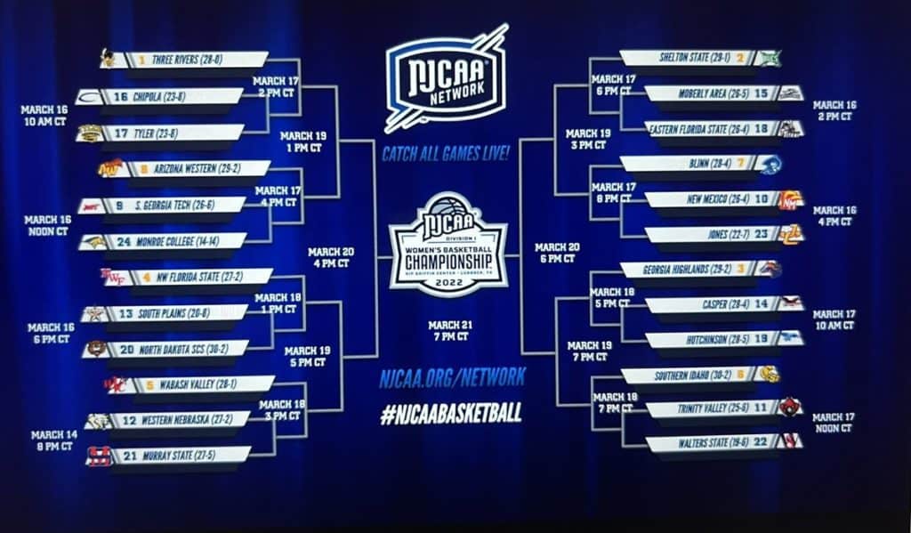Georgia Highlands Lady Chargers received the 3rd seed in the tournament and a first-round bye. They are scheduled to play the winner of the 14th ranked Casper College – 19th ranked Hutchinson team on Friday, March 18th at 5 p.m. The Lady Chargers are coached by former SGTC Coach Brandon Harrell.