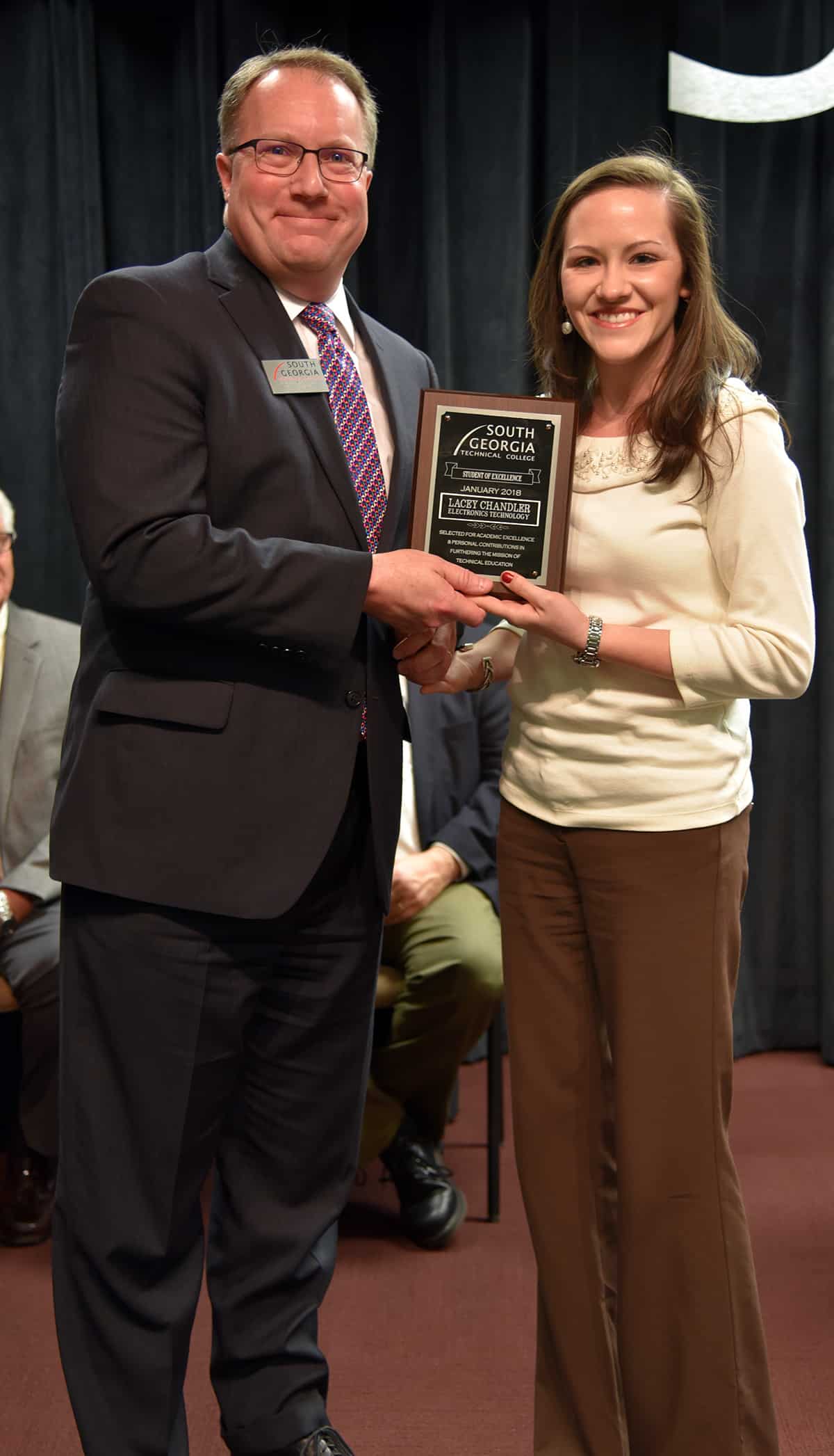 Lacey Chandler of Montezuma, an Electronics Technology student at South Georgia Technical College, was named the SGTC Student of Excellence for the month of January during a recent recognition ceremony held in the John M. Pope Industrial Technology Center on the college’s Americus campus.