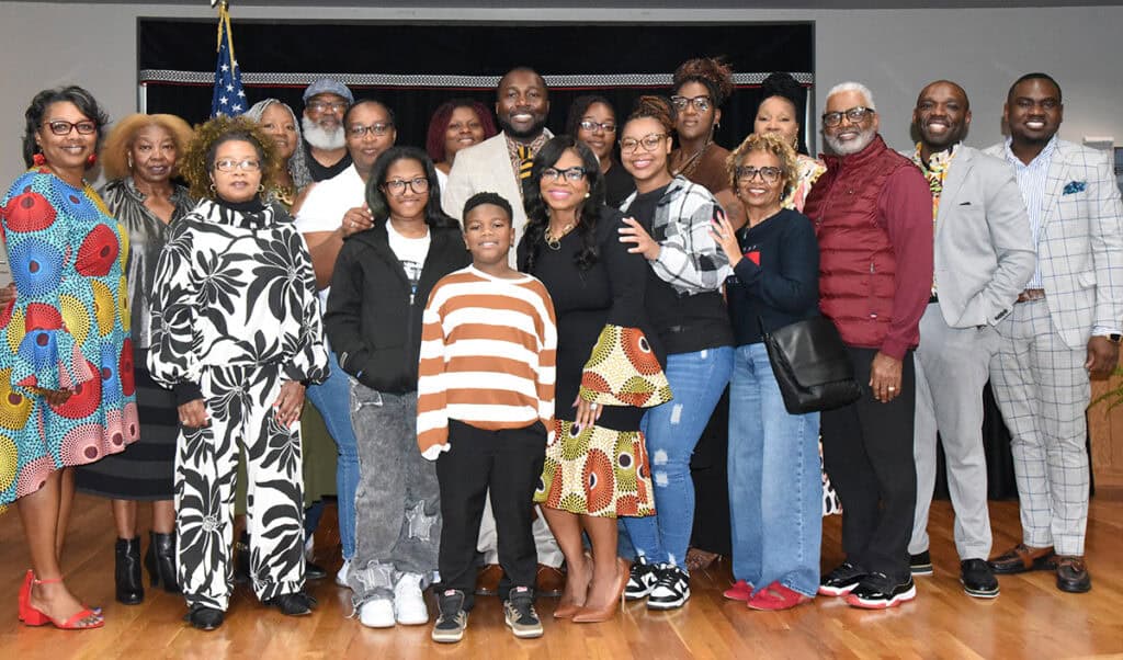 Sennica Harris is shown above with his family and friends after his talk as the keynote speaker at the SGTC Crisp County Center Black History Celebration.