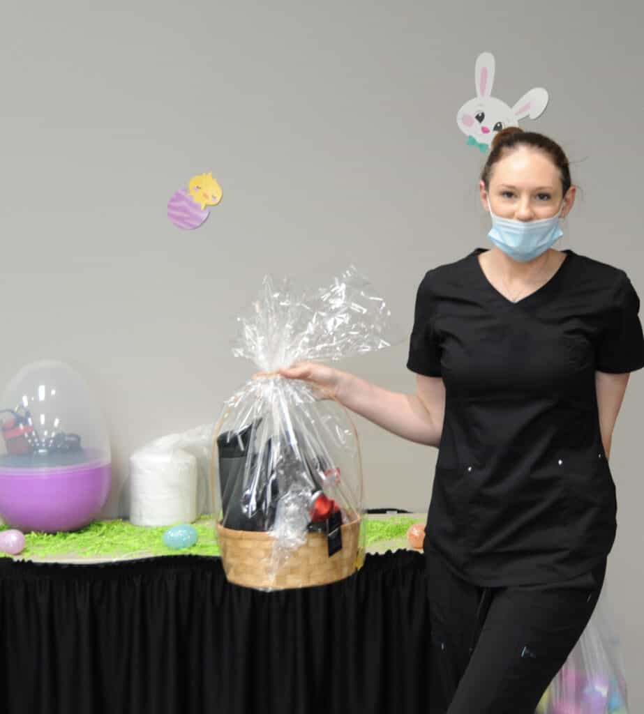 Jennifer Sparrow found the most eggs and she is shown with her prize.