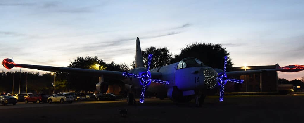 Individuals entered the campus by the P2 Navy Plane engulfed in lights.