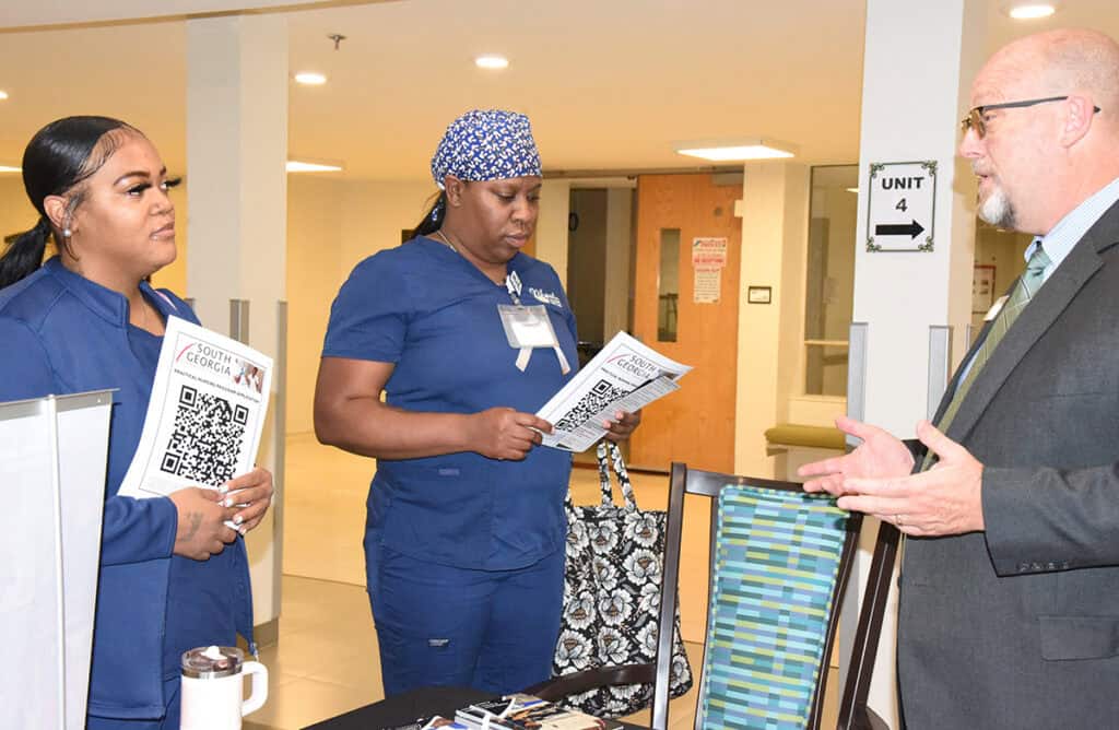 Diane Harrison, Magnolia Manor Senior Vice President of Human Resources joined with South Georgia Technical College Academic Dean Brett Murray, Admissions Director Candie Walters, and Financial Aid Director Kelly Everett to set up an on-site recruiting session at the Magnolia Manor Nursing Center during employee shift change to talk with employees about the partnership and how it could benefit employees looking to advance their skills and careers.