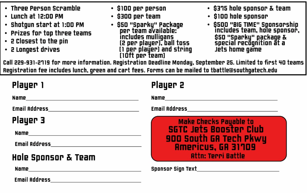 Make checks payable to the SGTC Booster Club, Attn. Terri Battle, 900 South Georgia Tech Parkway, Americus, GA 31709.