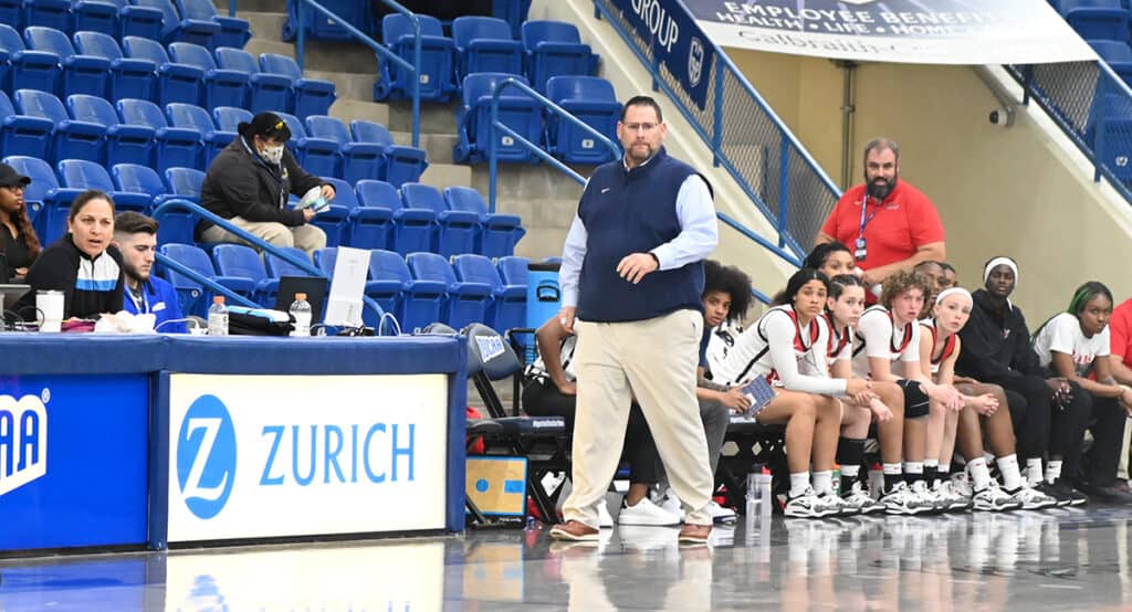 South Georgia Technical College Athletic Director and Lady Jets head coach James Frey (center), was selected as the World Exposure Report NJCAA Division I Women’ Basketball Coach of the Year. He is shown coaching the 2022 – 2023 Lady Jets at the NJCAA National Tournament in Lubbock, Texas.