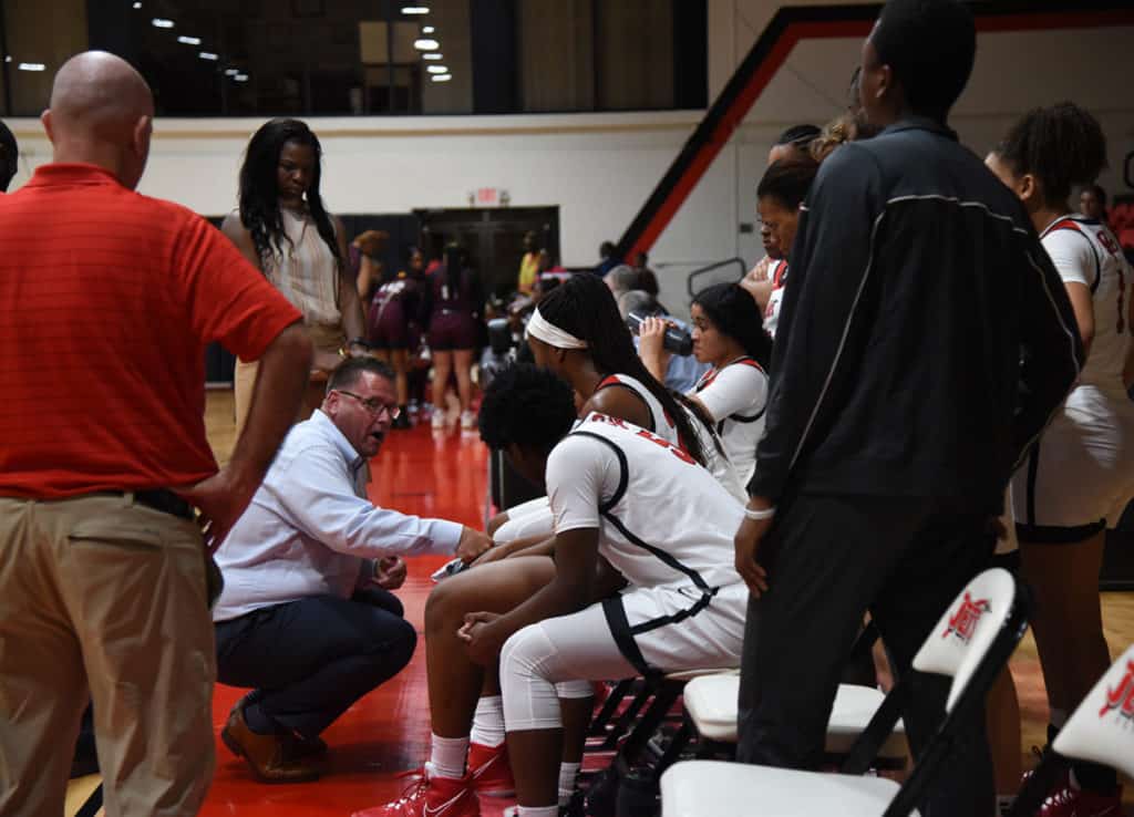 SGTC head coach James Frey is shown above talking with the Lady Jets during a time out.