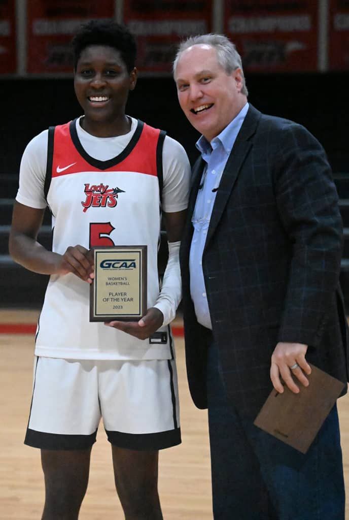 Sophomore Luana Leite, 5’ 7” from Sao Paola, Brazil, earned the GCAA Defensive Player of the Year award. She also averages 11.3 points per game. Fanta Gassama was the other SGTC Player recognized. The 6’ 1” center from Mataro, Spain, is the second leading scorer for the Lady Jets with 13.2 points per game. She is also the leading rebounder pulling down an average of 13.4 each game.