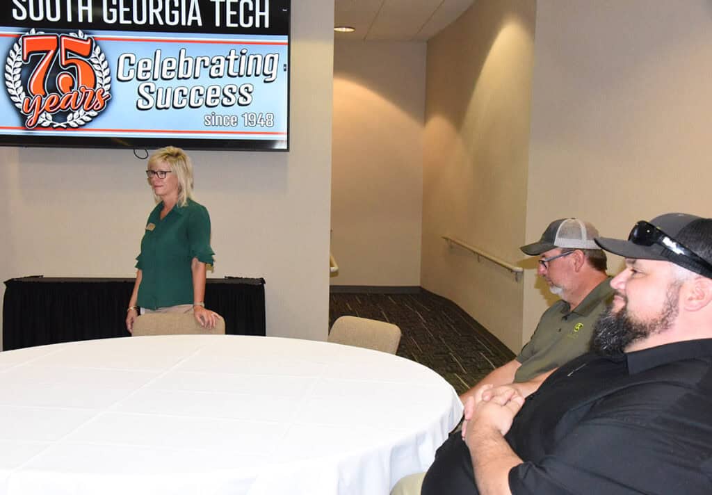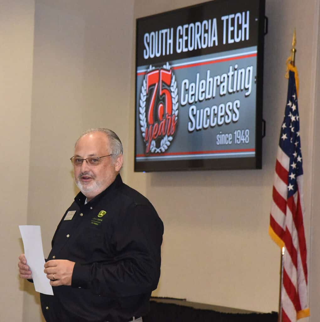 “On behalf of South Georgia Technical College President Dr. John Watford, I would like to welcome you to South Georgia Tech. Dr. Watford is out-of-town, but we are all excited about your decision to attend South Georgia Tech and the John Deere Agricultural Technology program. We train individuals for careers of a lifetime. Each of you in this room already know that you have a job waiting for you with John Deere as soon as you enroll. Our job is to provide you with the skills and knowledge that you need to become successful in you chosen career.”