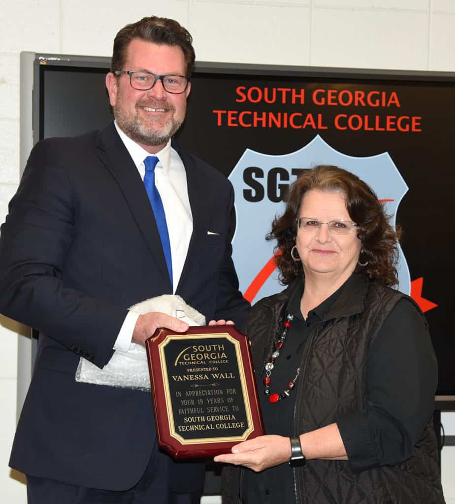 Then before continuing the graduation ceremony, Dr. Watford recognized retiring Assistant Vice President of Student Affairs Vanessa Wall, for her nearly two decades of service to the college. “Chief Wall played a major role in the start of the South Georgia Technical College Criminal Justice Program and the Law Enforcement Academy. She is one of the reasons we are all here today honoring these students. On behalf of the faculty and staff at South Georgia Technical College, I would like to congratulate you on your retirement and thank you for all that you have done to make this college a better place for the faculty, staff, and students. It is very fitting that we do this in the law enforcement classroom with students present.”